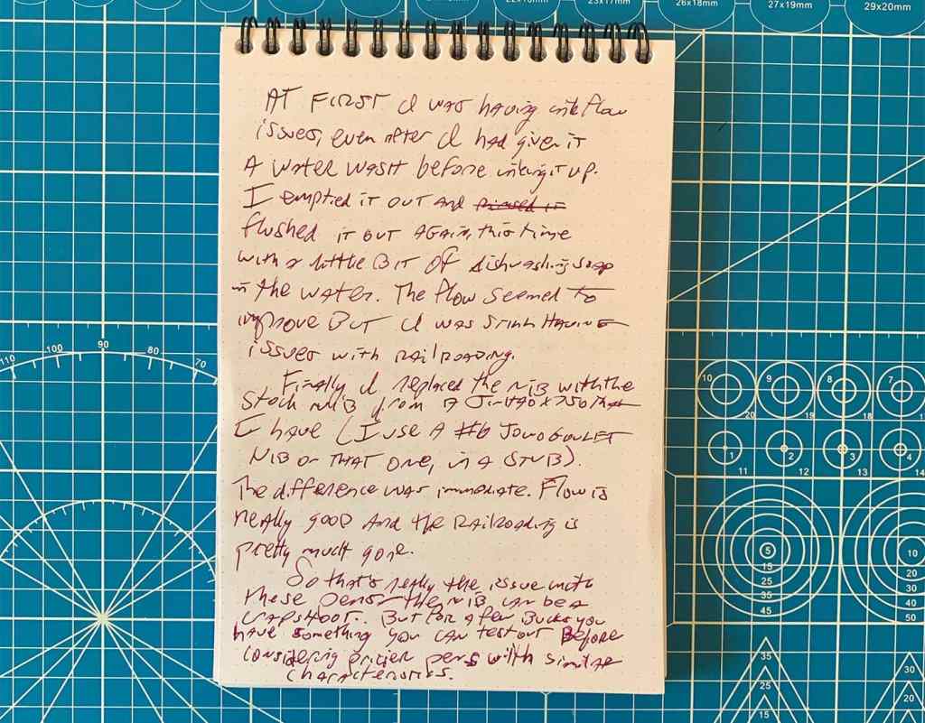 At first I was having ink flow issues, even after I had given it a flush before inking it up. I emptied it out and washed it again, this time using a drop of dishwashing soap. The flow seemed to improve but I was still having issues with skipped lines.