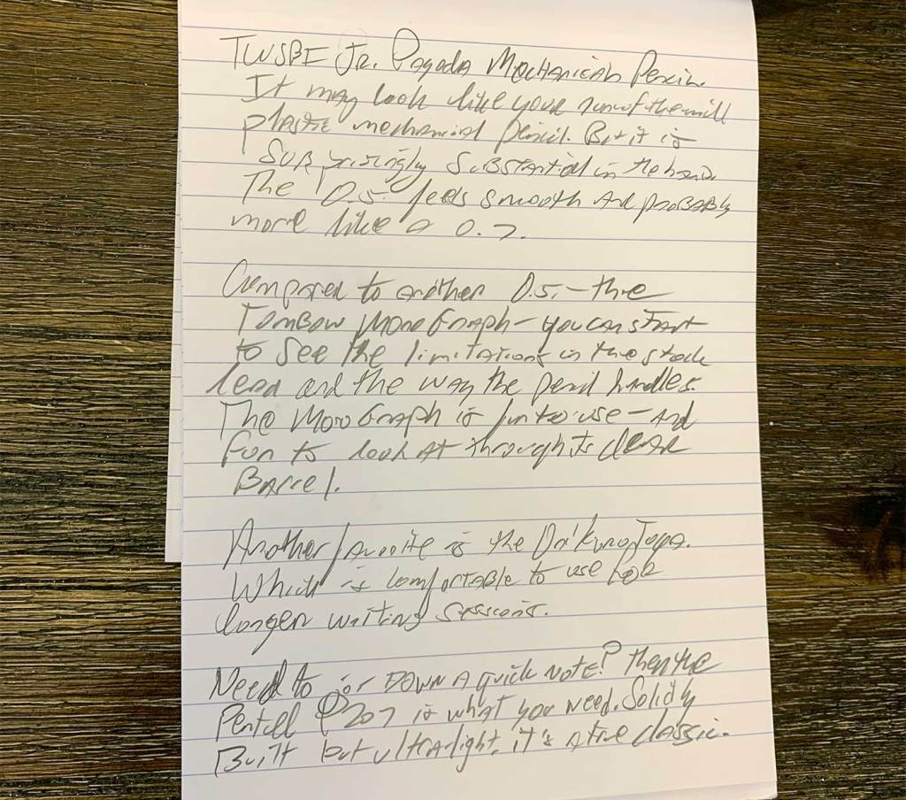 But in terms of how I like to use my pencils, I would actually give a slight edge to the TWSBI Jr. Pagoda over this Pentel. I do not think the TWSBI is a better pencil—the Pentel beats it in overall quality. But the Pagoda just works better for me because of its thicker barrel.