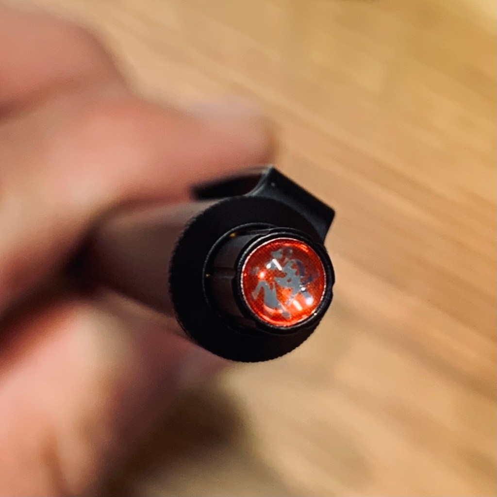 This is a hefty, stealthy, brass-barreled pen that feels substantial and tough. The gel ink glides and slides wonderfully on paper. Even the knurling on the grip section is good. The clicker is satisfying and the small red icon in the finial is a nice touch.